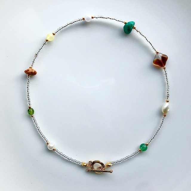長さ:37cm 涼しげなクリアビーズに様々なガラスビーズやシェルビーズ等のモチーフを通しました✴︎ 緑や黄色が夏のお花を連想させます♡ 留め具はマンテルを使用しております。 鎖骨の真ん中のくぼみ辺りにマンテルが来るような長さになっております♡ ※注意事項 全ての商品を簡易ラッピングさせて頂き発送致します。 1点ずつ心を込めて手作業で制作しておりますが、色や形に若干の違いが生じる場合がございますのでご了承ください。 ご使用後は金具部分をティッシュ等でお拭き取りの上、高温多湿を避けた場所にて保管頂けますと綺麗な状態が維持できます。 色や素材感はできるだけ実物に近いものを掲載しておりますが、光の具合やPC環境などにより違いが生じる場合がございます。 お届けした商品に破損や不備、商品の不足があった場合、商品到着後3日以内にご連絡ください。確認の上で、至急交換または返品の対応をさせていただきます。