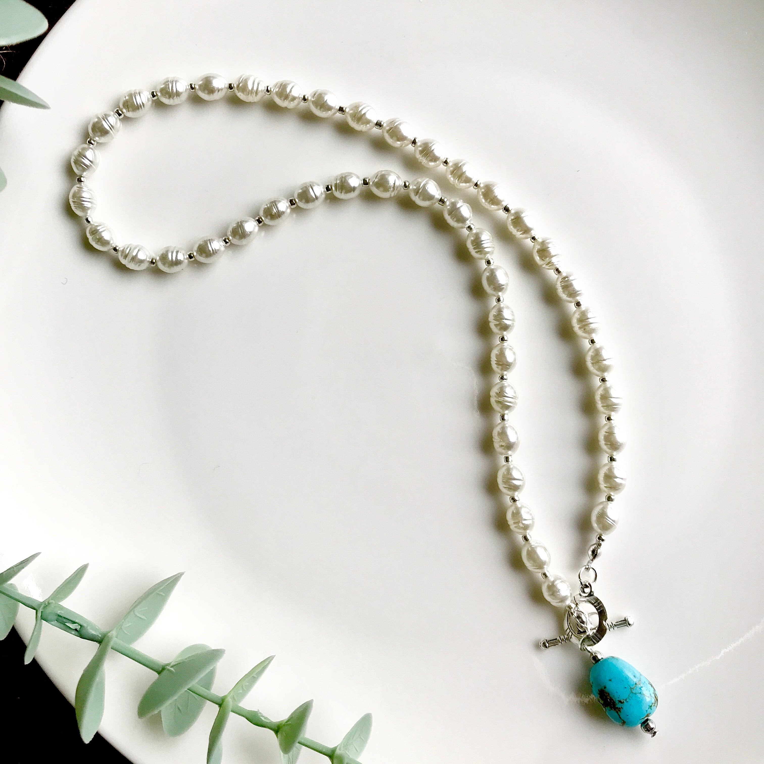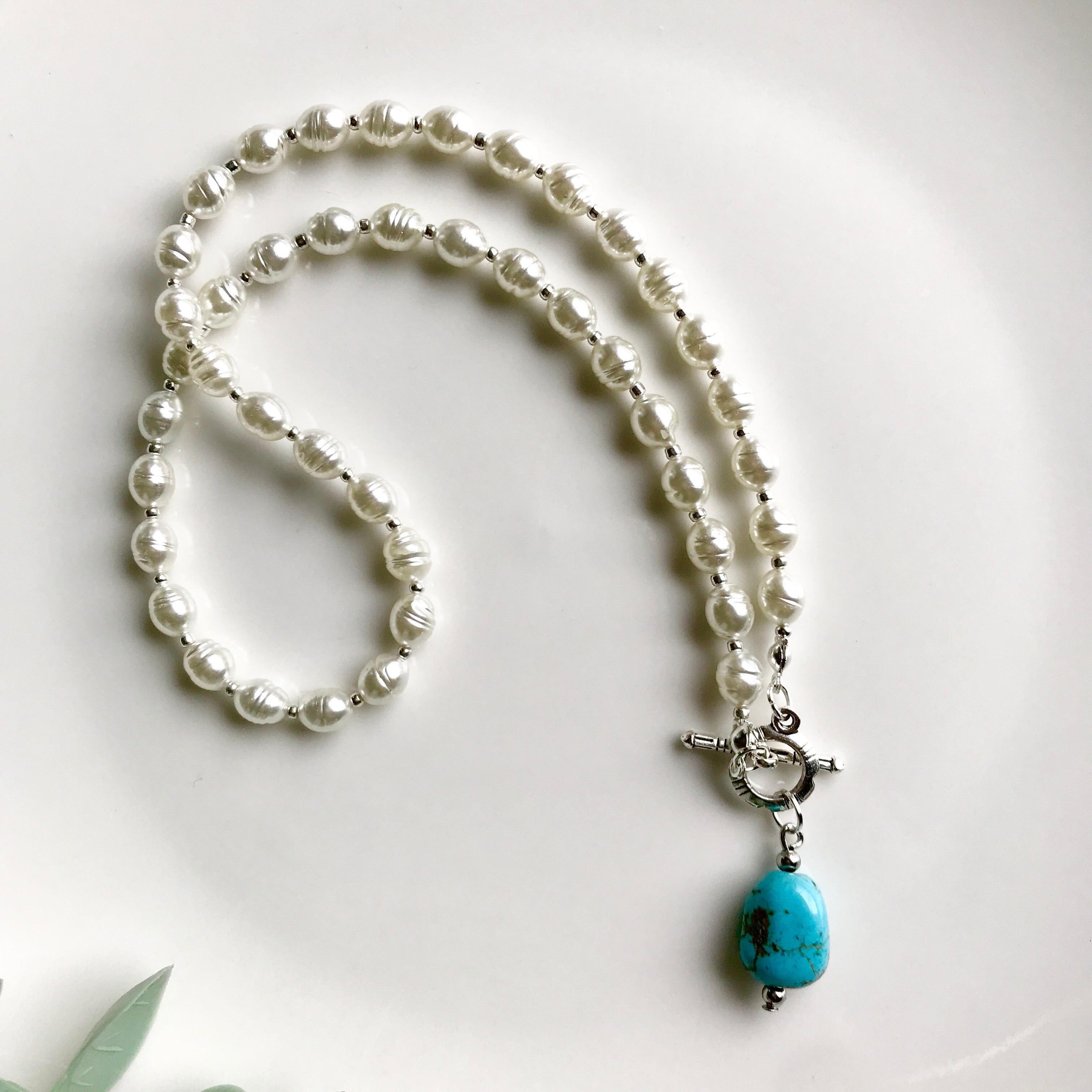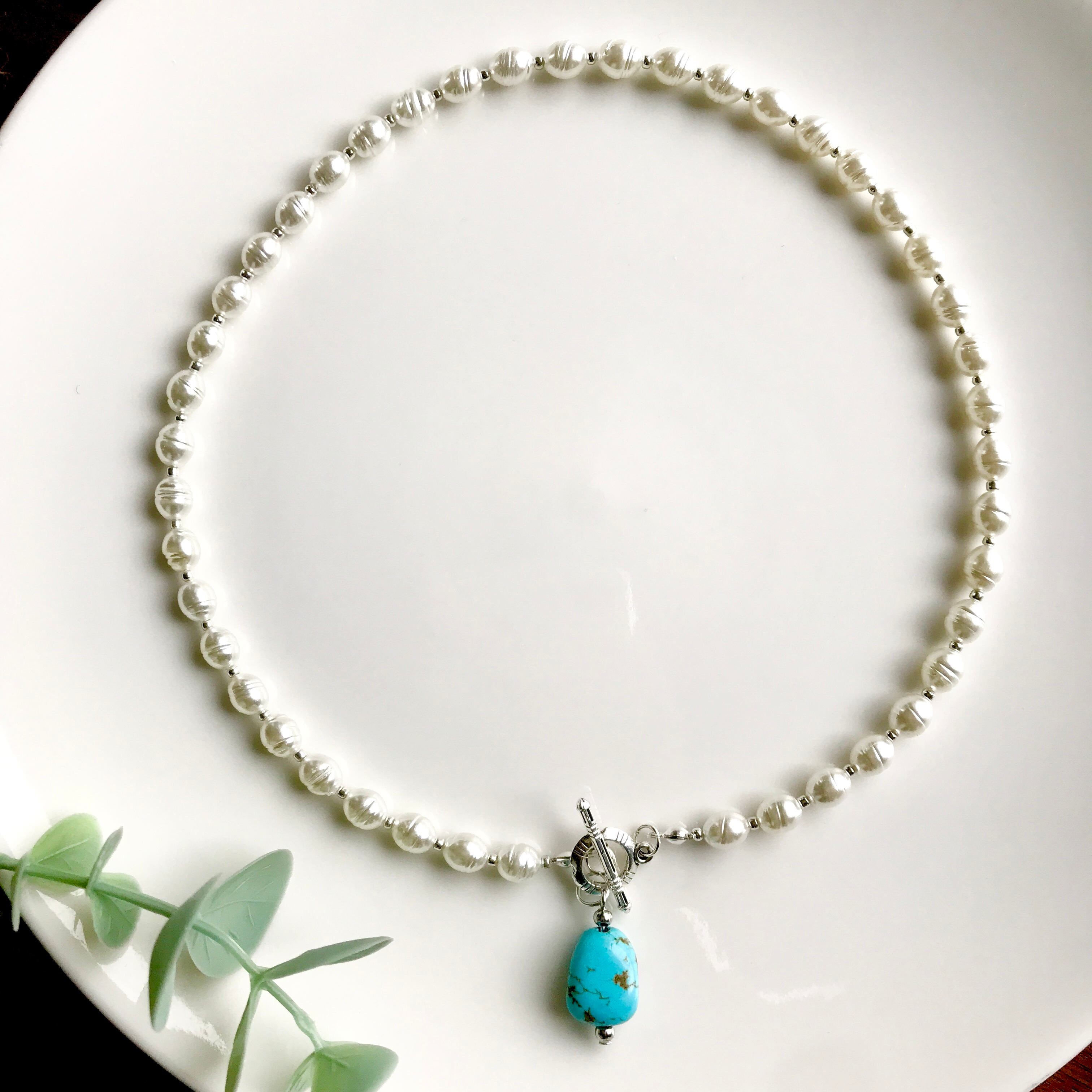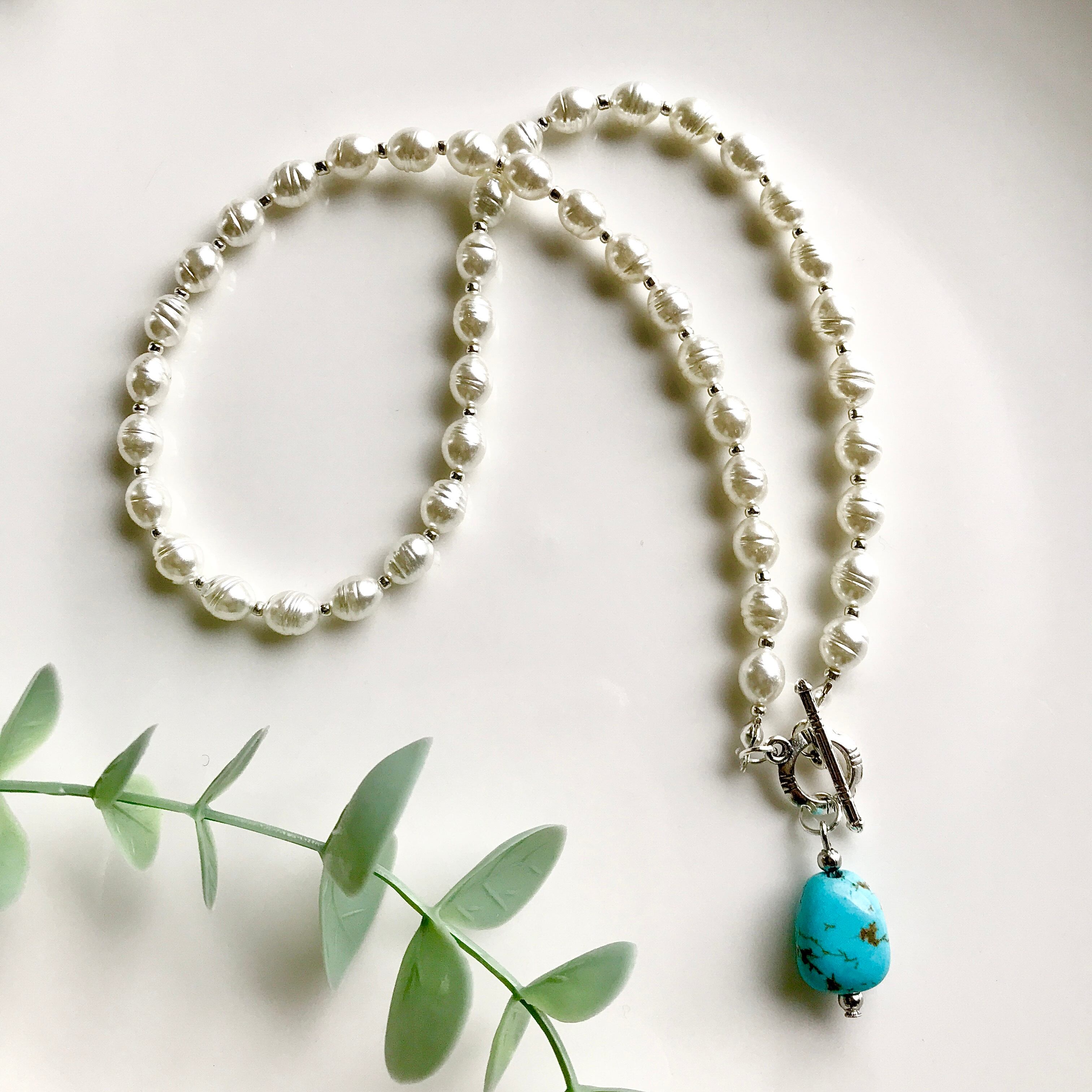 樹脂パールのネックレスにターコイズ(天然石)をぶら下げました。