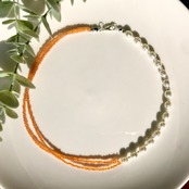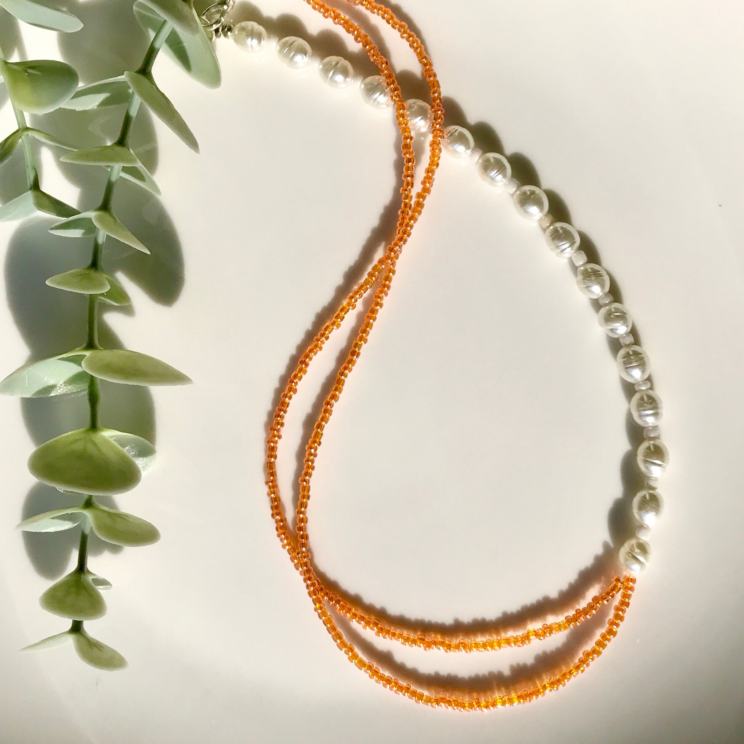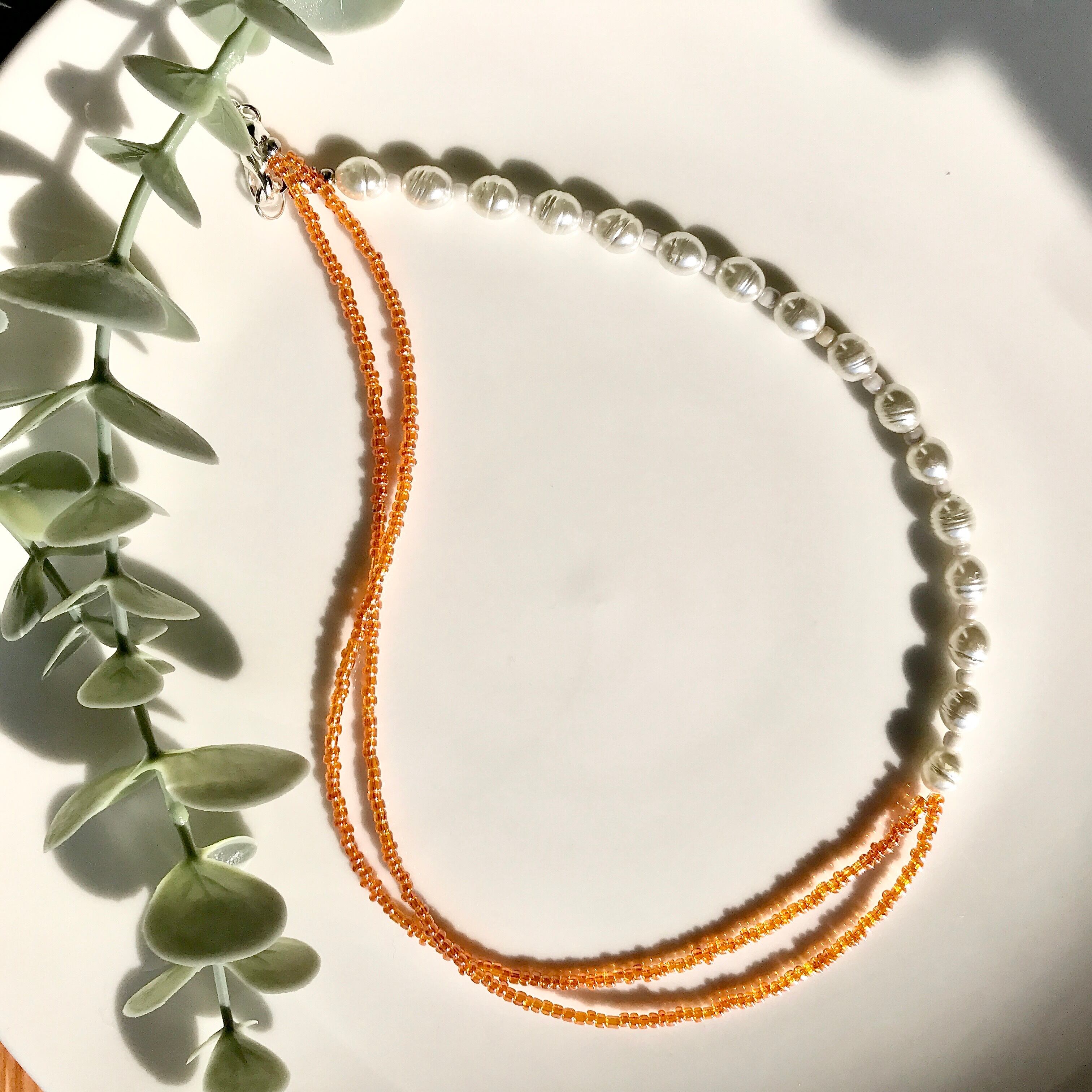 鮮やかなオレンジと樹脂パールが首元を華やかにさせます。