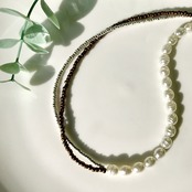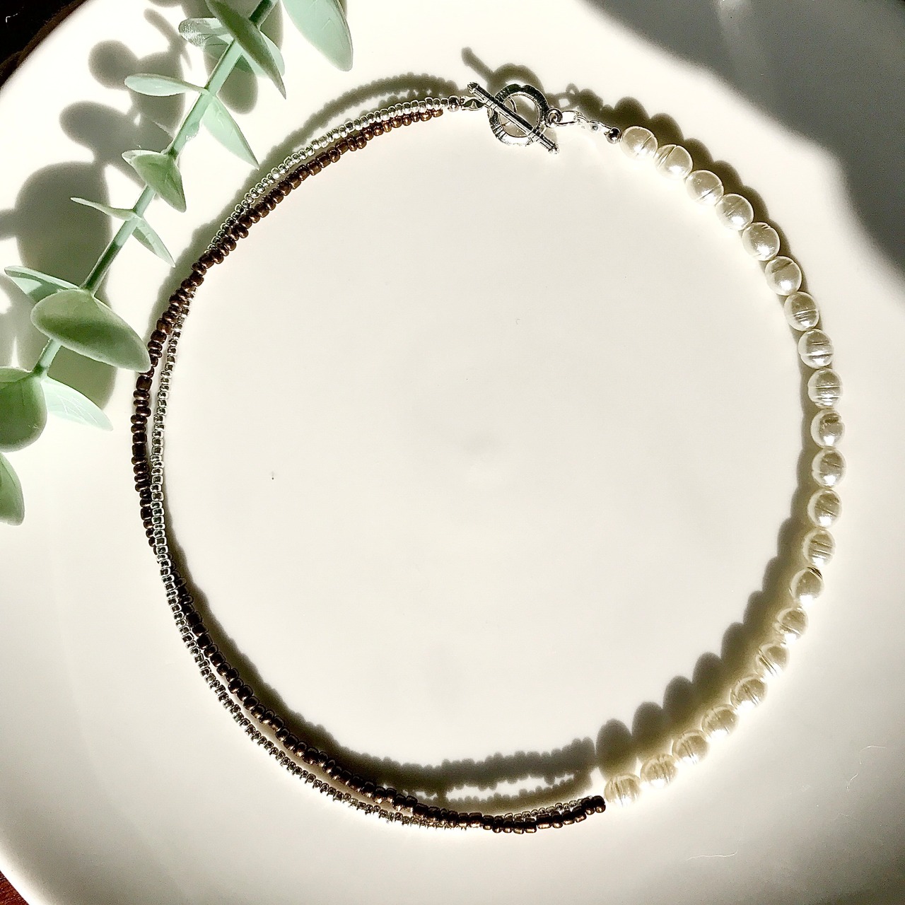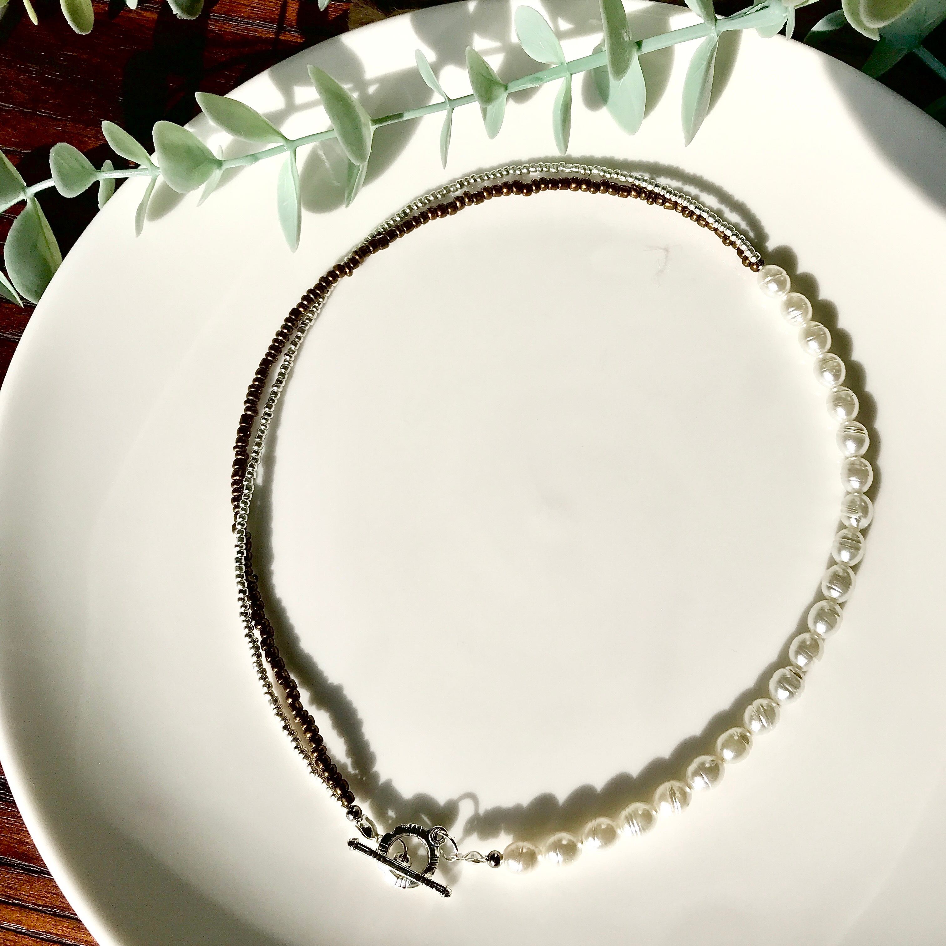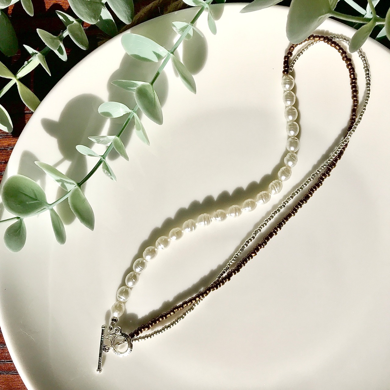 トレンドのパールネックレスにブラウンとシルバーの2本ラインでカジュアルに♪