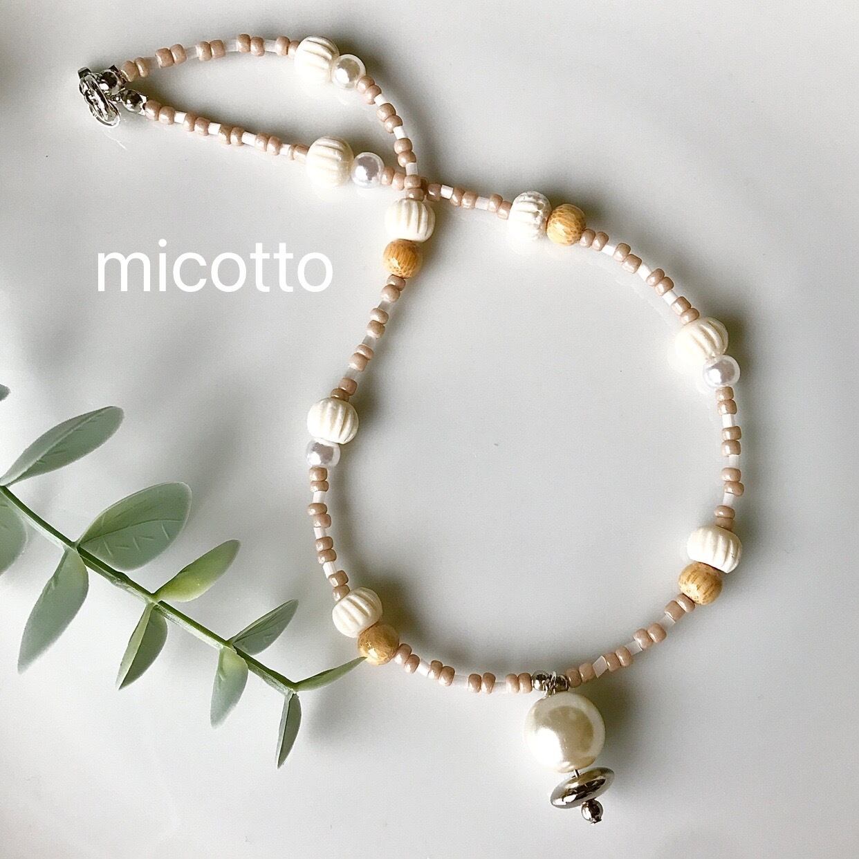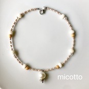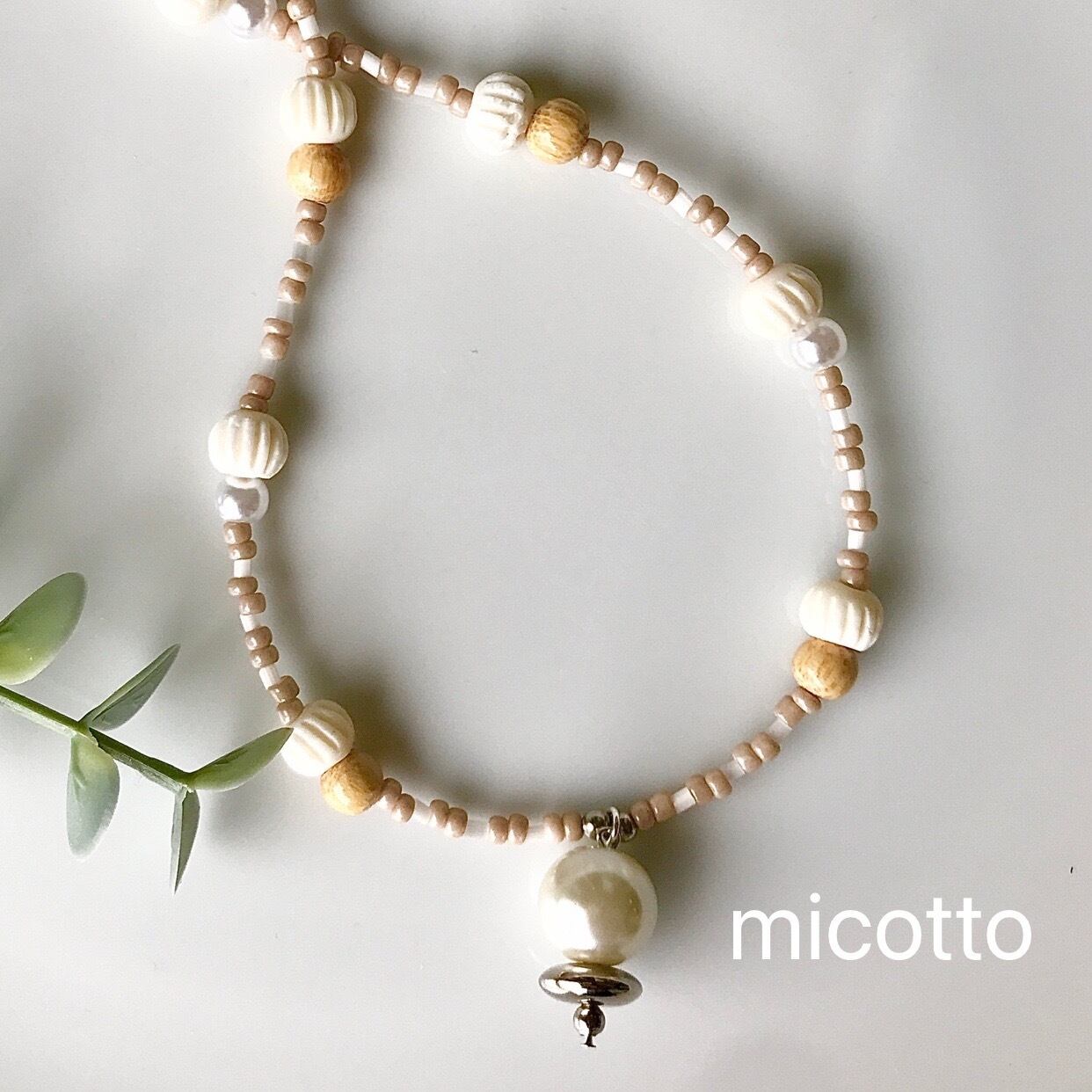 ボーンビーズとウッドビーズがカントリー調で可愛いデザインです。フロントの大ぶりパール&シルバーモチーフがアクセントになっています。