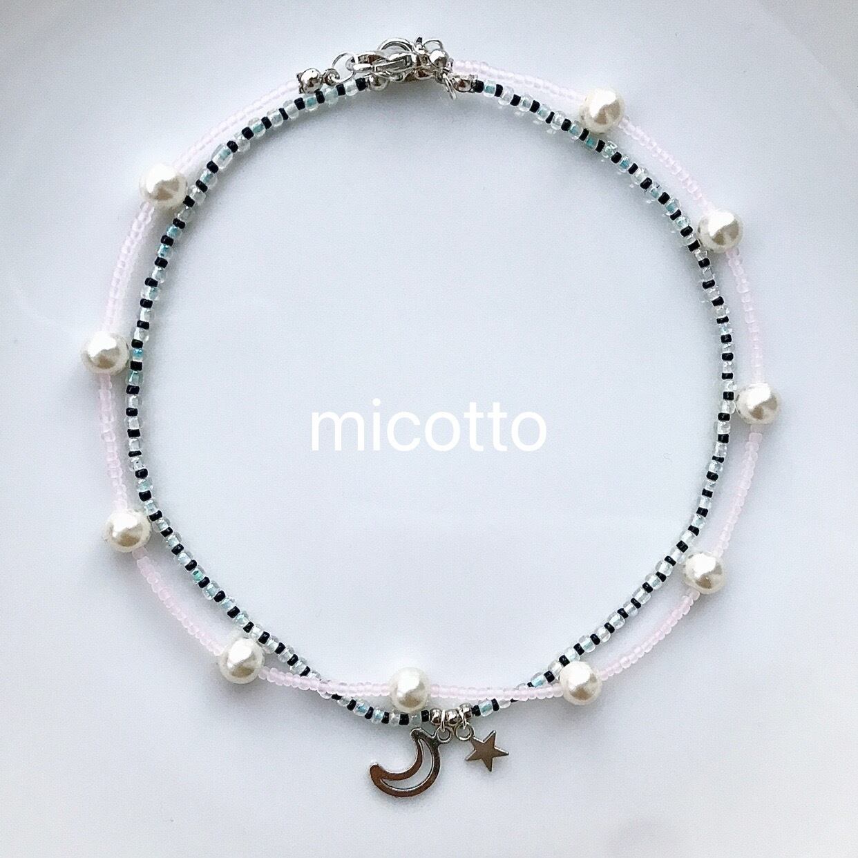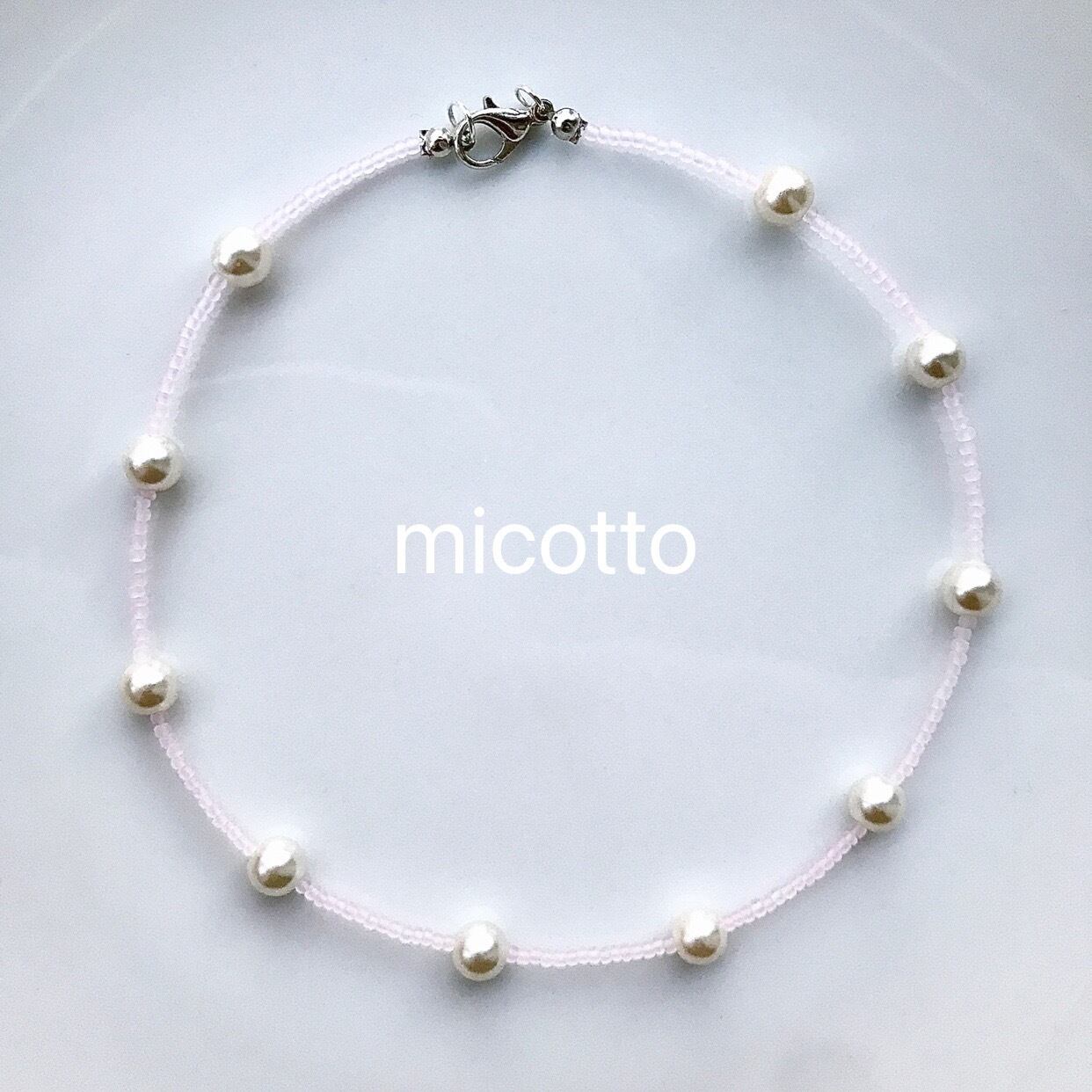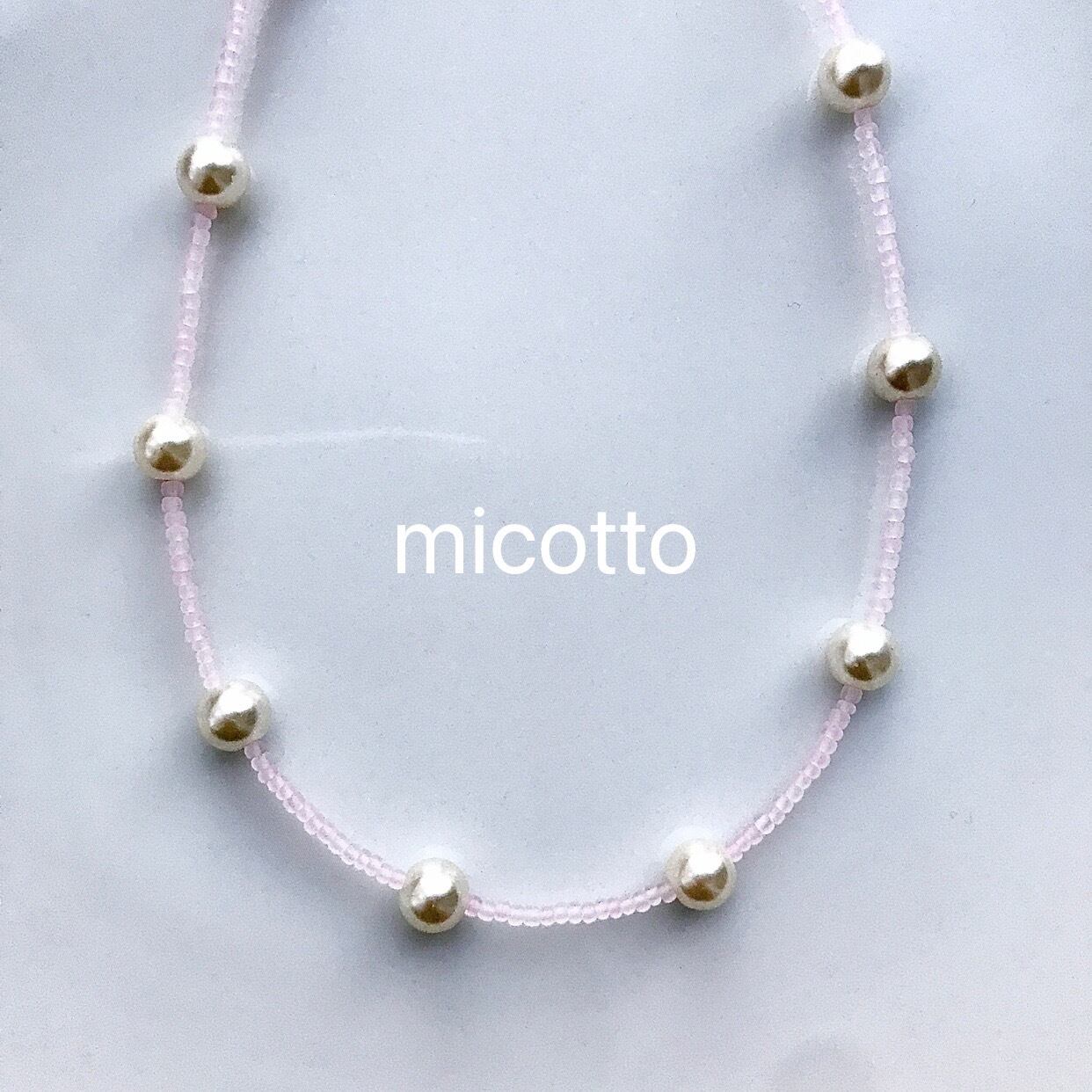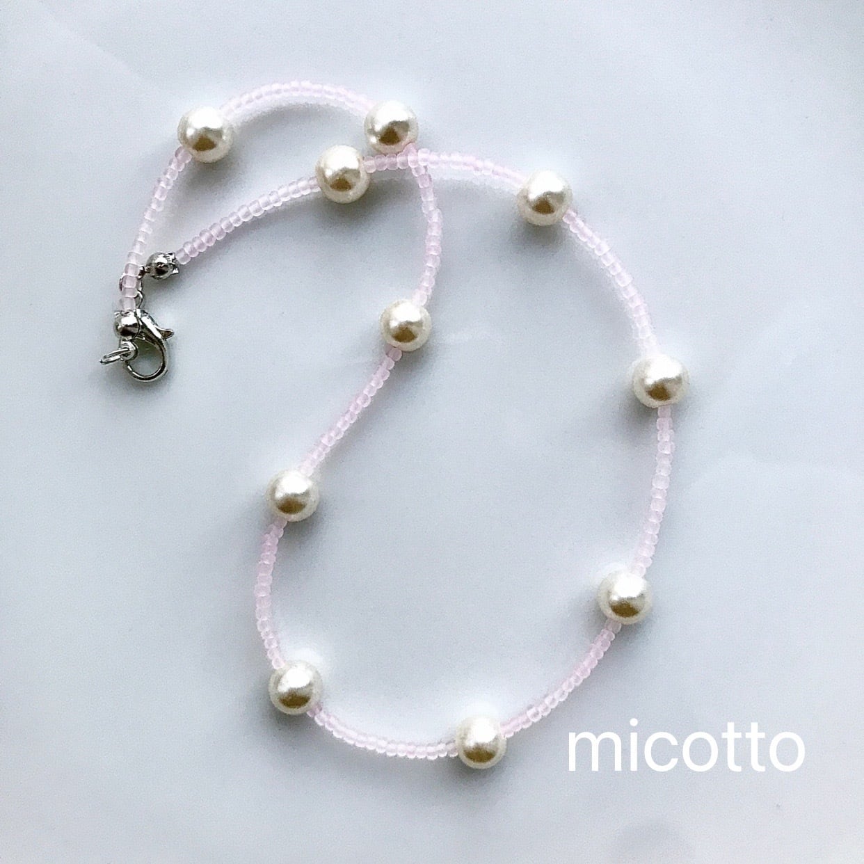 マットな薄ピンクのビーズに大ぶりパールをふんだんに使用したビーズチェーンが可愛いです✴︎