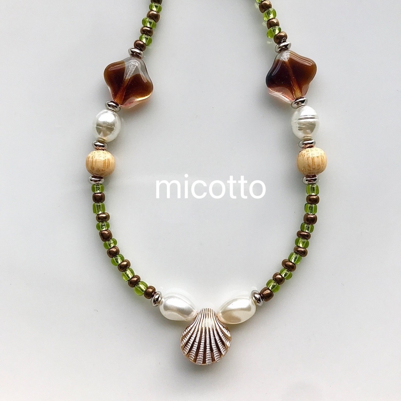個性的なガラスビーズやウッドビーズを散りばめ、フロントにはシェルモチーフを通しました♪